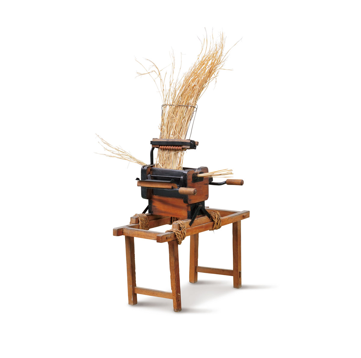 This machine consists of a frame made of wood and metal, equipped with a drum featuring comb-like teeth. By pressing a foot pedal, the drum rotates, and when the rice ears are pressed against it, it separates the grains from the husks.
